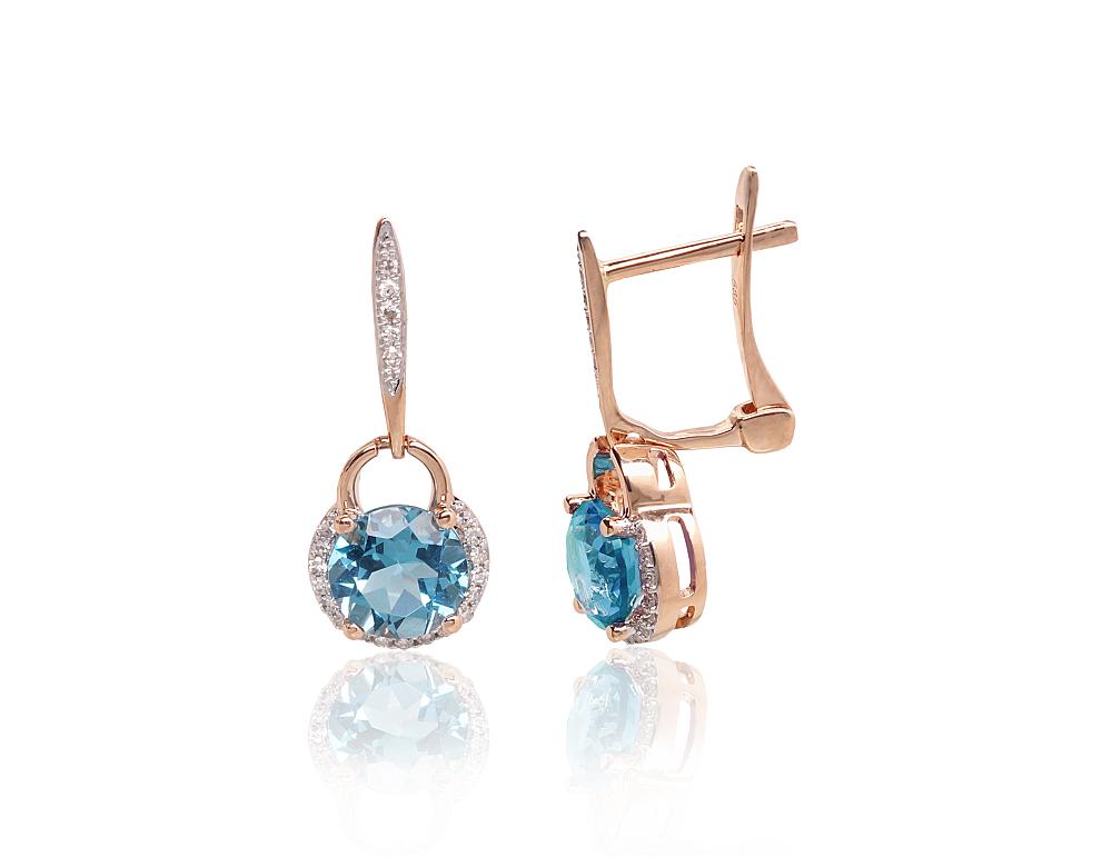 Materiāls: Sarkanais Zelts 585°, rodijs (pārklājums) Svars: 2.63 g Akmens: Briljanti (0,112Ct), Zilais topāzs
